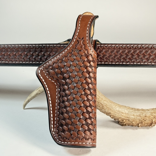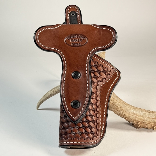 The Chief Holster is a neutral cant (straight up and down) holster that rides a little lower on the belt. A great looking and functioning holster that comes standard with a secure thumbbreak. The Chief is fully lined with high quality Hermann Oak leather and accepts most RMR or Optic sights. We add wings to the drop to allow for more contact with your carry belt ensuring a safe, stable carry. Shown with optional Basketweave tooling.