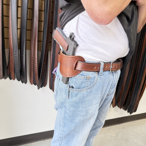 Well we’ve all known about pancake holsters but what about a Flatcake holster? The Flatcake has been around for many decades. They seem to get forgotten about from time to time. These simple little one-sided holsters ride closer to the body than just about anything we make. They work very well with single stack style guns such as 1911s. We have customers that use them with double stack Glocks and such but we recommend soaking the holster for a few minutes then put it on your belt, insert gun and let it mold and dry to the gun. The more you use the Texas Slide, the better it gets. Truly ambidextrous, can be worn anywhere on your belt. If you are going to be driving all day, wear it crossdraw for a quick, easy presentation. If you have to enter an area where firearms are prohibited, no problem. The Texas Slide just flattens out against your belt and doesn’t resemble a holster.